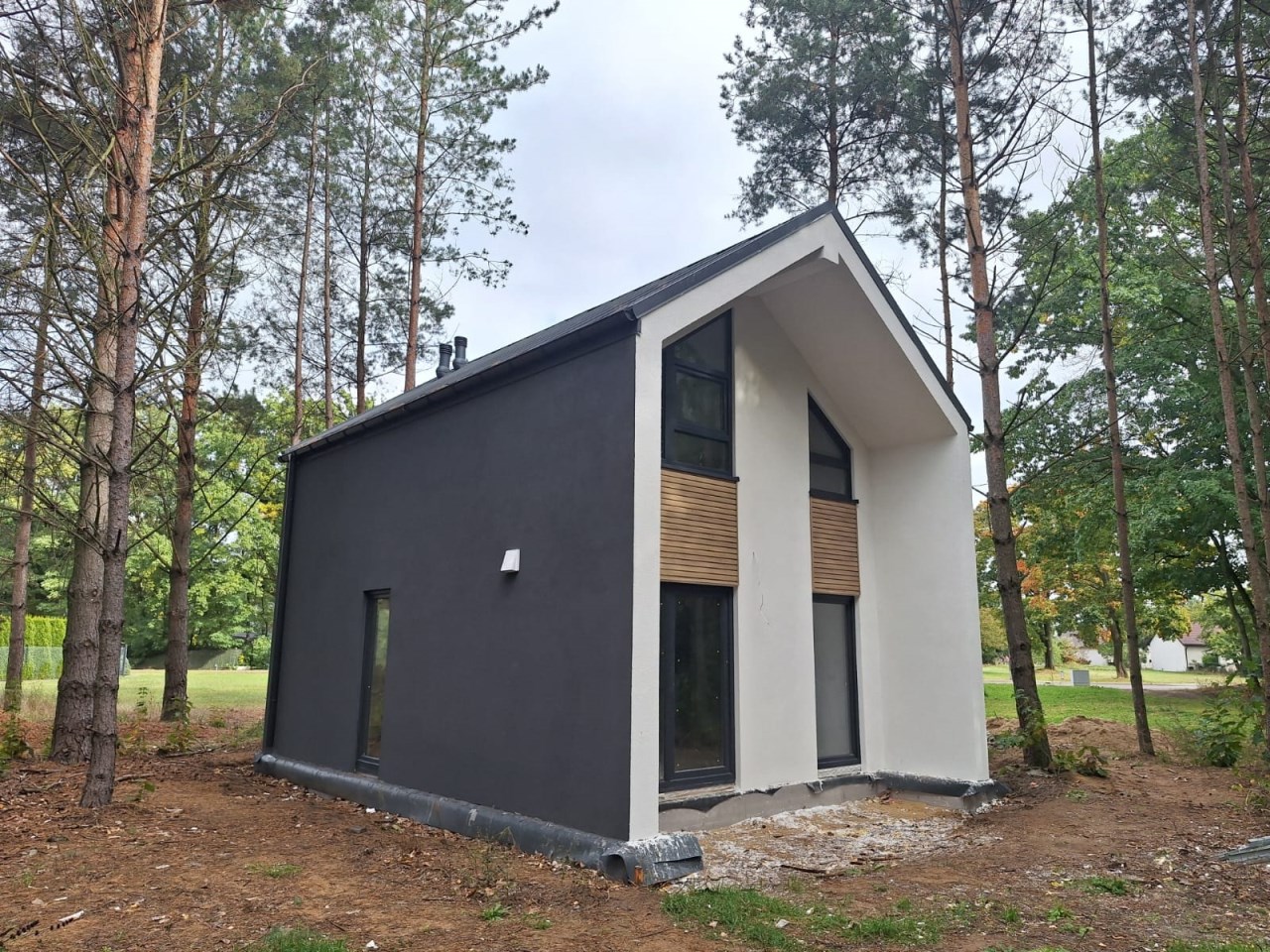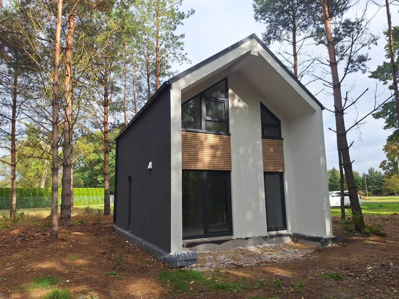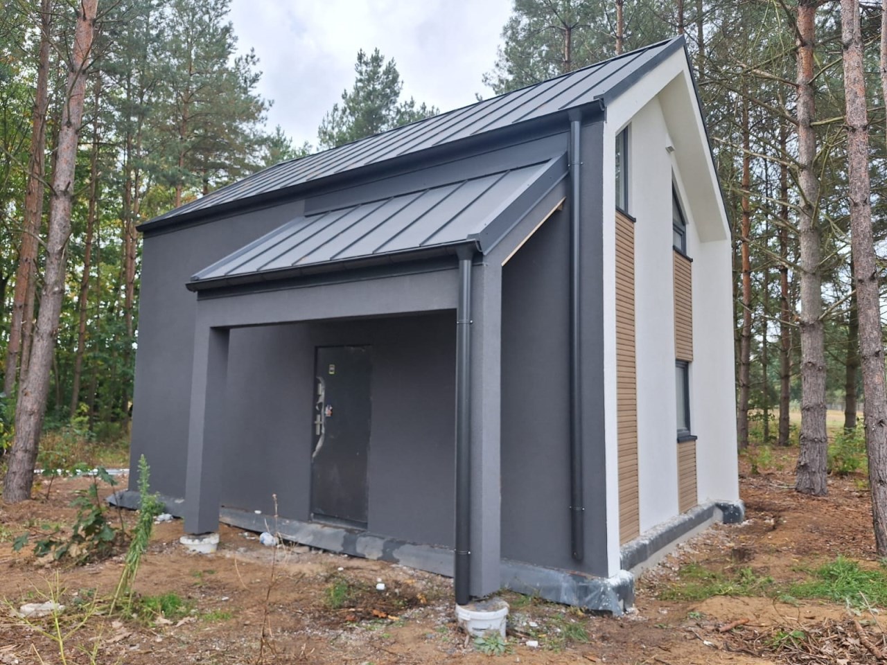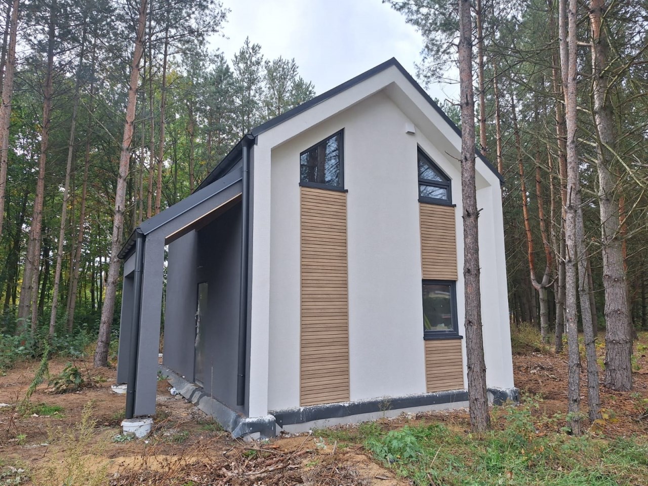 Dom zostanie doprowadzony do stanu deweloperskiego wrzesień 2025. Dom na zgłoszenie, całoroczny (U < 0,20), energooszczędny z rekuperacją, postawiony na płycie fundamentowej. Działka o statusie budowlanym z przeznaczeniem mieszkaniowym. Elewacja domu grafitowa z elementami imitacji drewna, ściana frontowa i tylna białe.
