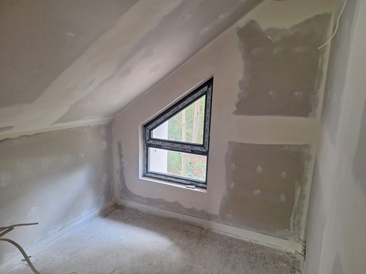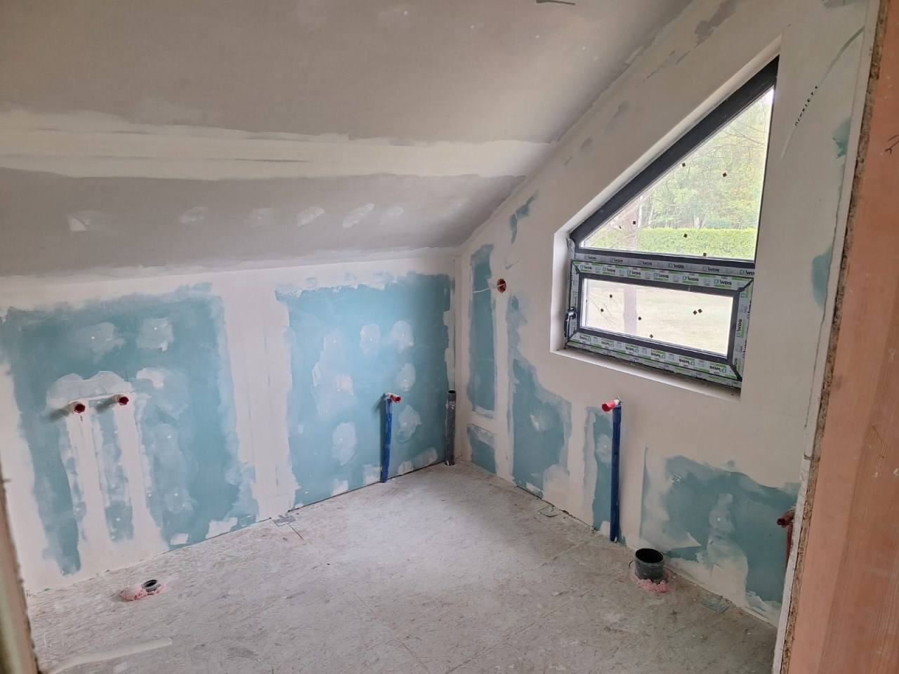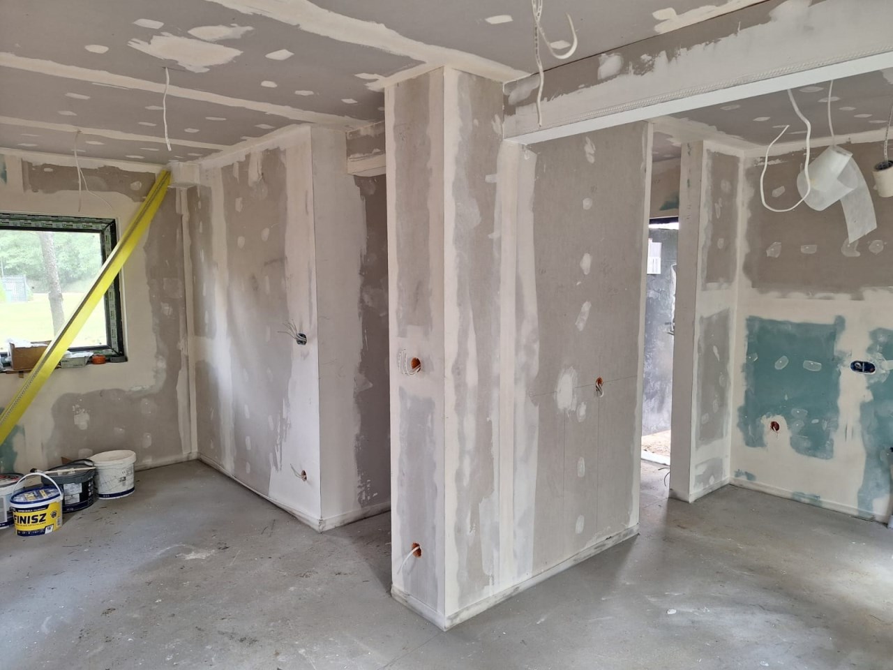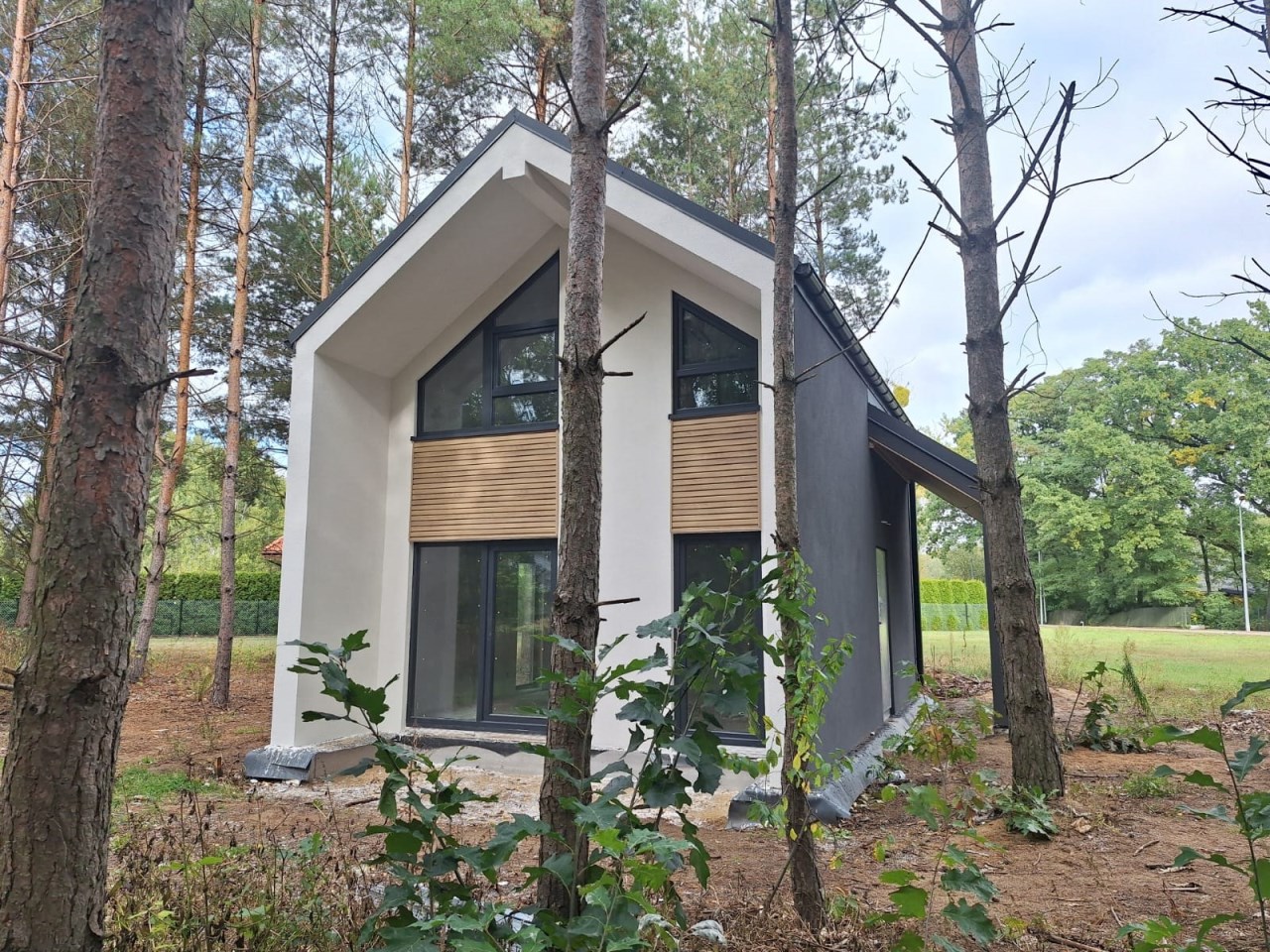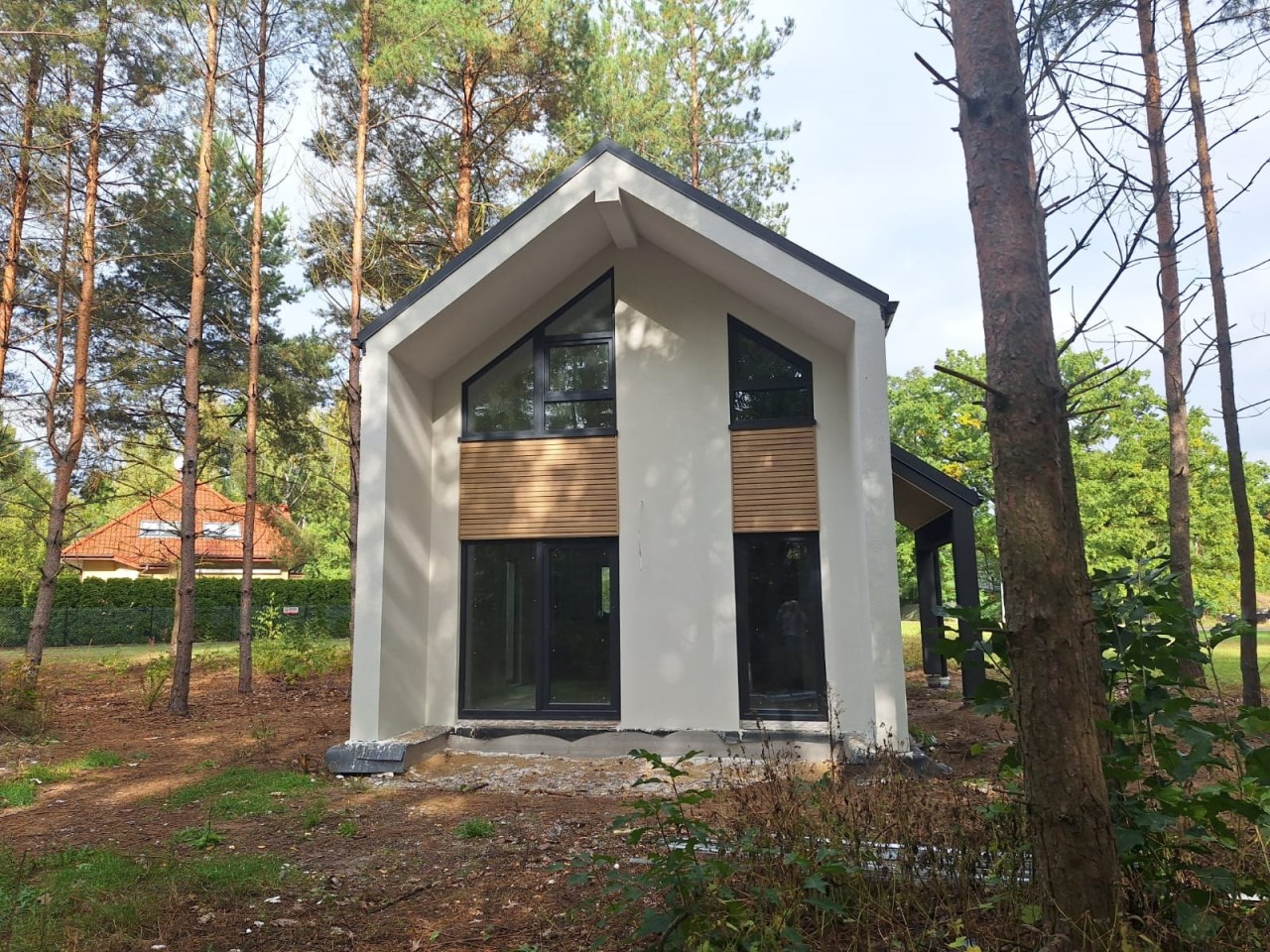 Dom zostanie doprowadzony do stanu deweloperskiego wrzesień 2025. Dom na zgłoszenie, całoroczny (U < 0,20), energooszczędny z rekuperacją, postawiony na płycie fundamentowej. Działka o statusie budowlanym z przeznaczeniem mieszkaniowym. Elewacja domu grafitowa z elementami imitacji drewna, ściana frontowa i tylna białe.
