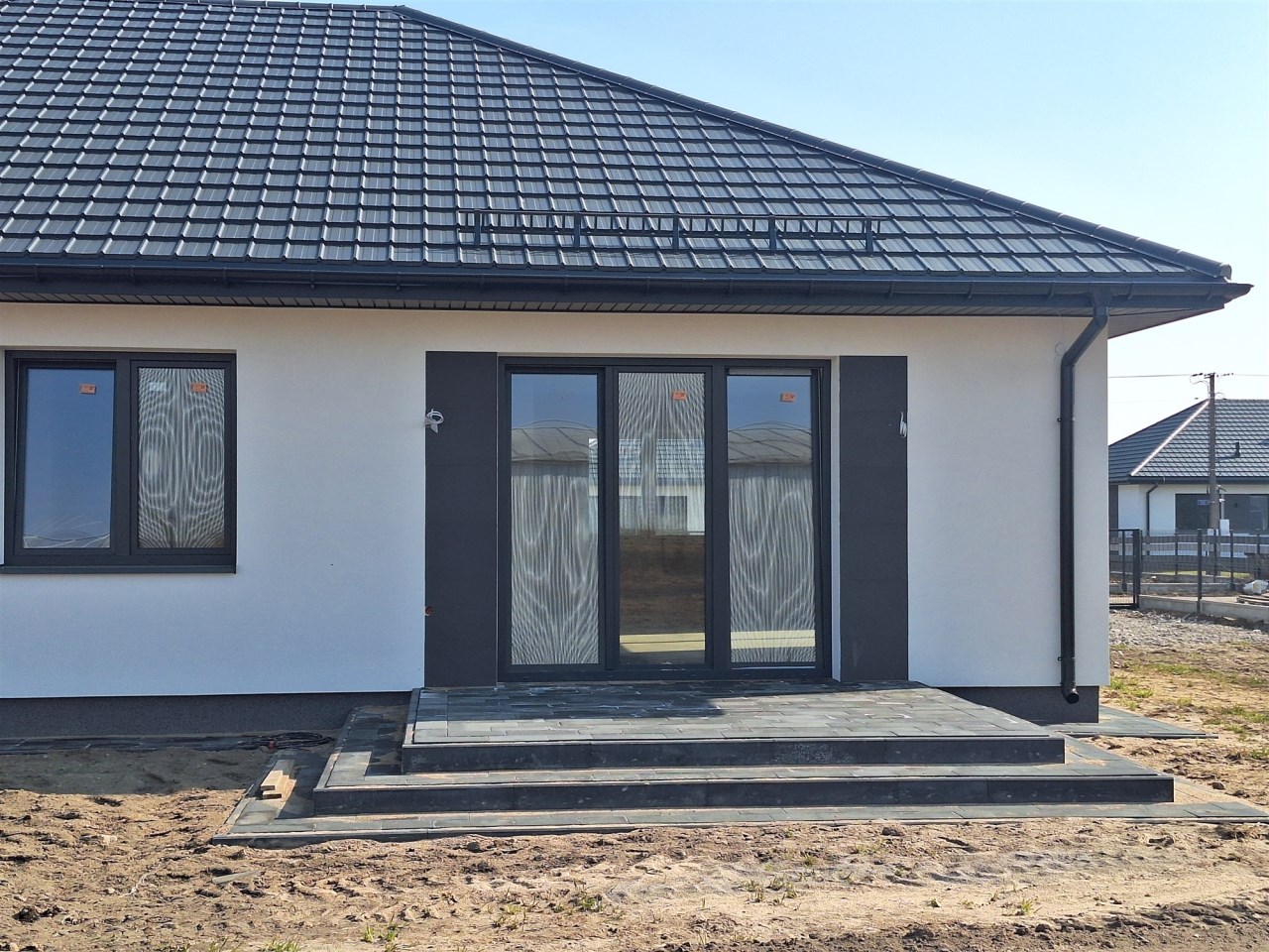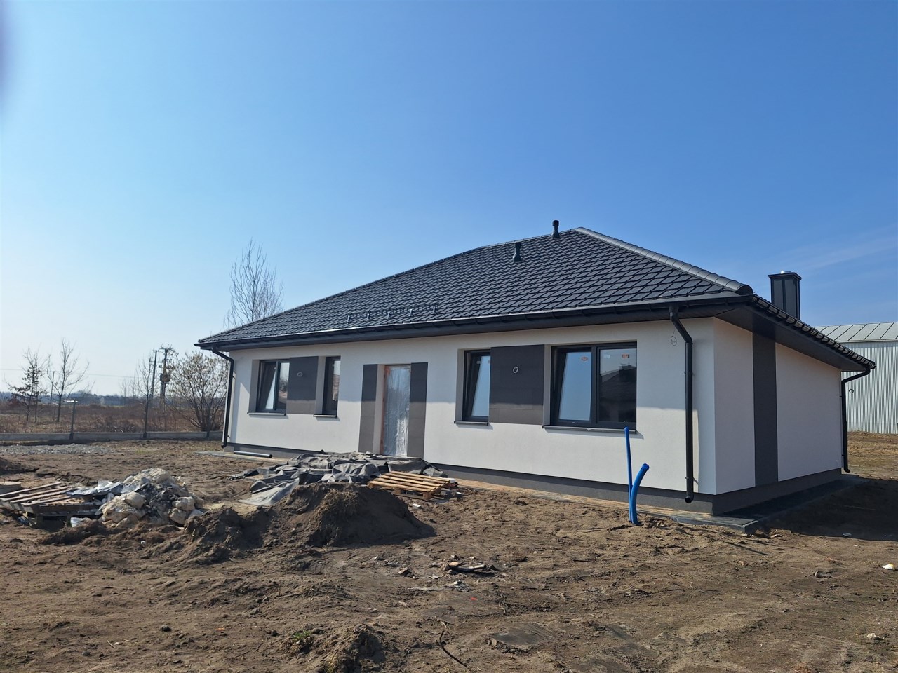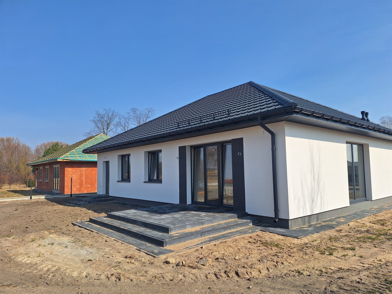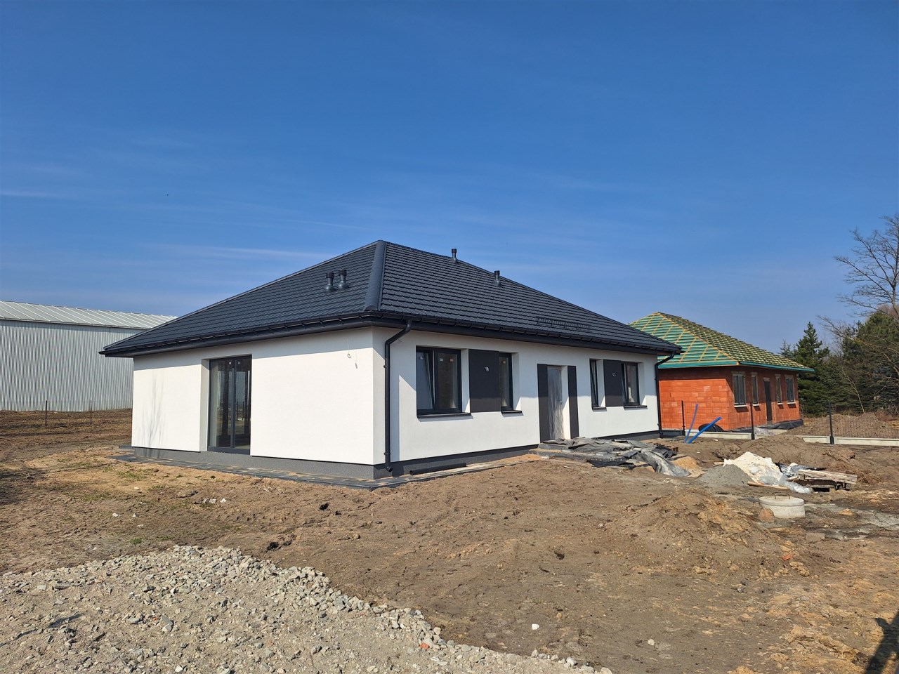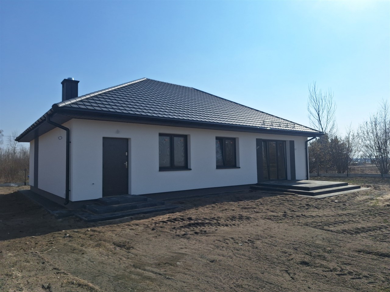 Drugi etap inwestycji w w sielskiej wsi Kamionna gm. Winnica, powiat pułtuski, koło Nasielska. W ofercie dom parterowy o powierzchni 115 mkw w stanie deweloperskim, posadowiony na działce 1160 mkw (nr ew. 32/26). Dom wzniesiony w technologii tradycyjnej, murowanej, ściany z pustaków ceramicznych. Dach pokryty blachodachówką w kolorze grafit. Okna trzyszybowe. Rozprowadzona instalacja wodna, elektryczna i ogrzewanie podłogowe (ogrzewanie do wyboru: gaz, pellet, pompa ciepła). Działka zagospodarowana: ogrodzona systemem panelowym z bramą i furtką; chodnik do drzwi wejściowych; opaska wokół domu; taras. Garaż blaszany 2-stanowiskowy na fundamencie za dodatkową opłatą 20 tys,