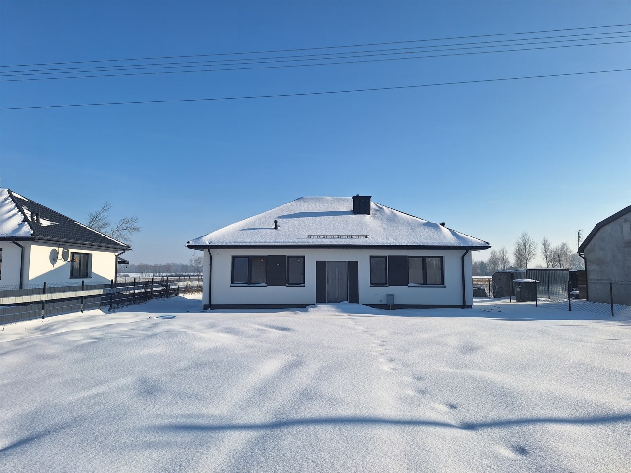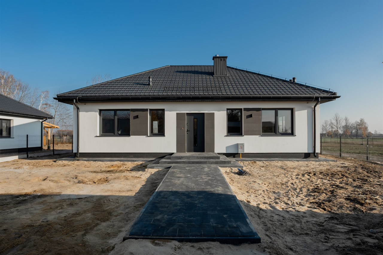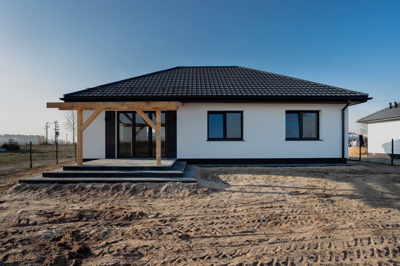 Drugi etap inwestycji w w sielskiej wsi Kamionna gm. Winnica, powiat pułtuski, koło Nasielska. W ofercie sprzedaży dom parterowy o powierzchni 95 mkw w stanie deweloperskim, posadowiony na działce 1416 mkw (nr ew. 32/34). Dom wzniesiony w technologii tradycyjnej, murowanej, ściany z pustaków ceramicznych. Dach pokryty blachodachówką w kolorze grafit. Okna trzyszybowe. Rozprowadzona instalacja wodna, elektryczna i gazowa (ogrzewanie podłogowe). Działka zagospodarowana: ogrodzona systemem panelowym z bramą i furtką; chodnik do drzwi wejściowych; opaska wokół domu; taras z drewnianą pergolą. Możliwość zakupu garażu blaszanego 2-stanowiskowego za dodatkową opłatą 20 tys.