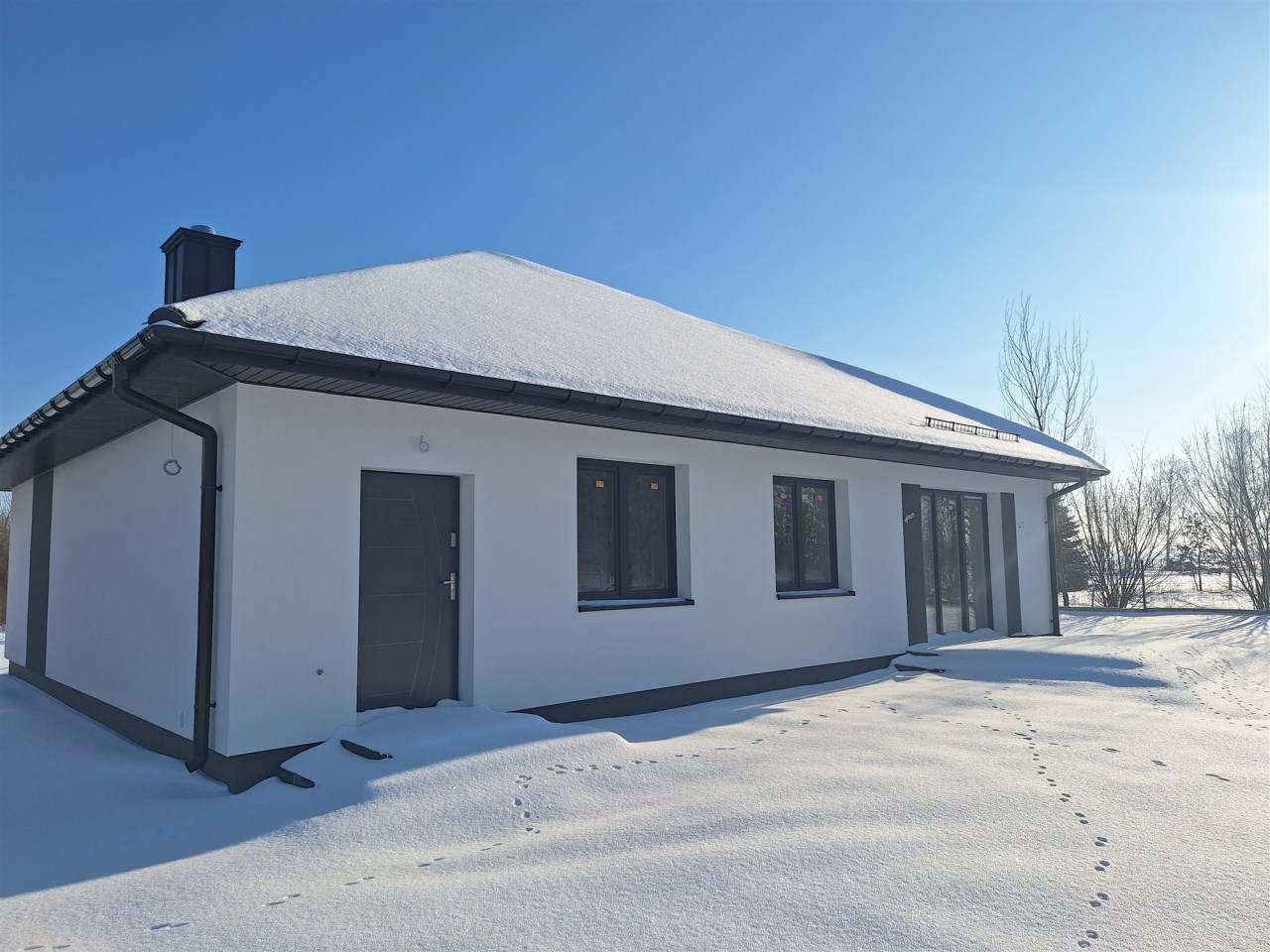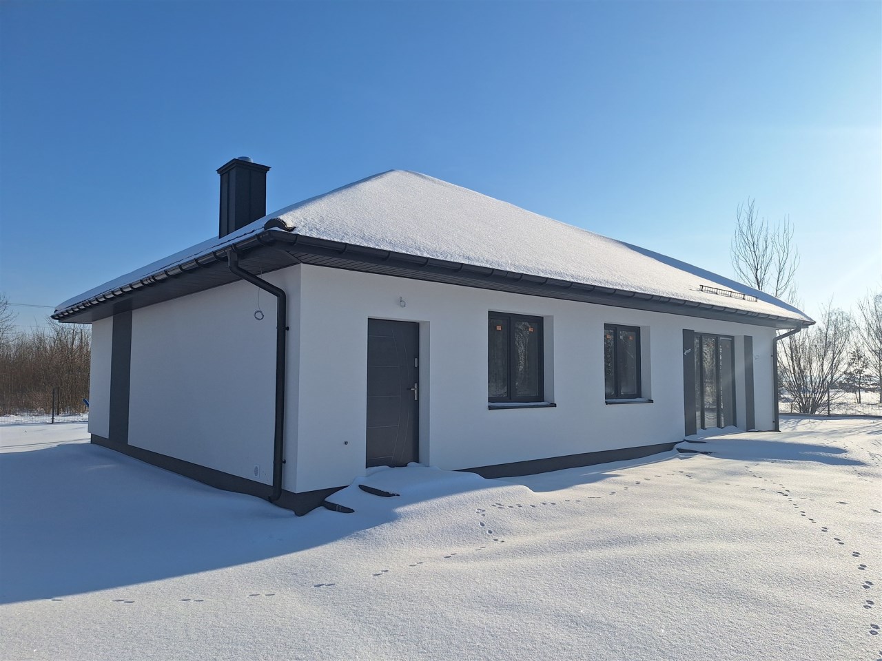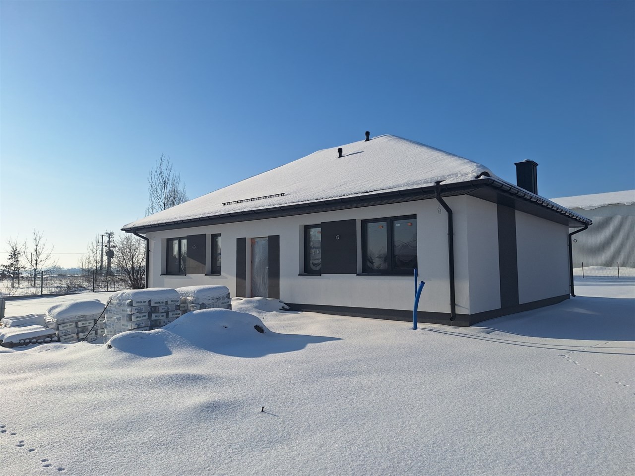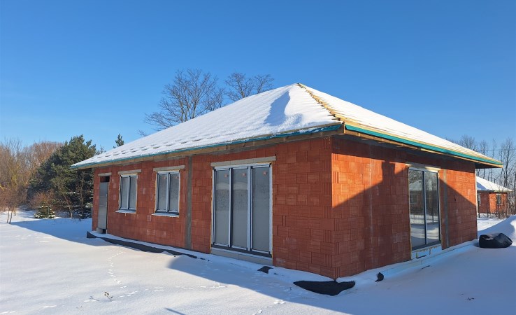 Drugi etap inwestycji w w sielskiej wsi Kamionna gm. Winnica, powiat pułtuski, koło Nasielska. W ofercie dom parterowy o powierzchni 115 mkw w stanie deweloperskim, posadowiony na działce 1160 mkw (nr ew. 32/26). Dom wzniesiony w technologii tradycyjnej, murowanej, ściany z pustaków ceramicznych. Dach pokryty blachodachówką w kolorze grafit. Okna trzyszybowe. Rozprowadzona instalacja wodna, elektryczna i ogrzewanie podłogowe (ogrzewanie do wyboru: gaz, pellet, pompa ciepła). Działka zagospodarowana: ogrodzona systemem panelowym z bramą i furtką; chodnik do drzwi wejściowych; opaska wokół domu; taras. Garaż blaszany 2-stanowiskowy na fundamencie za dodatkową opłatą 20 tys,