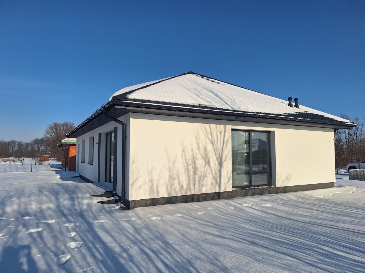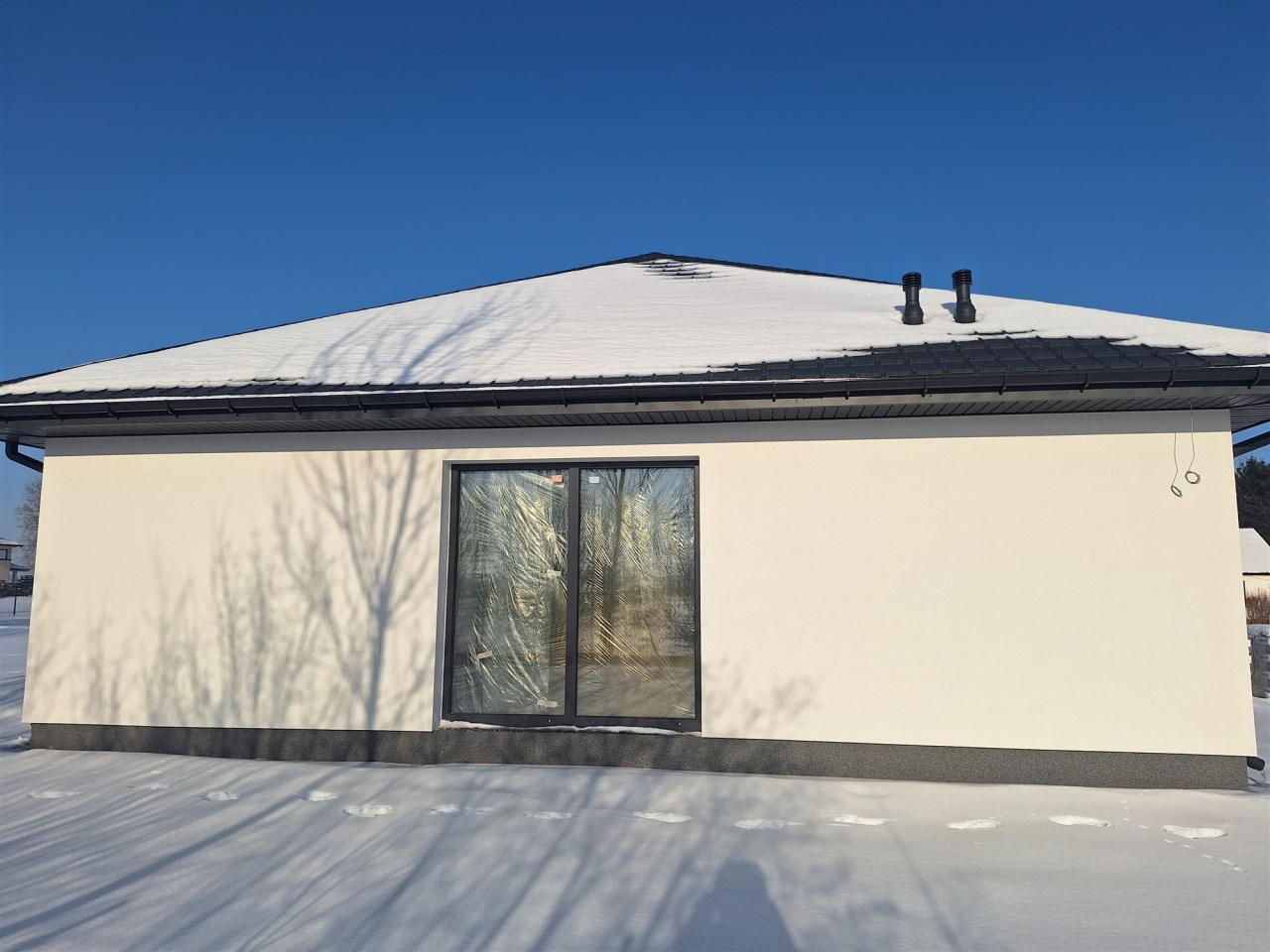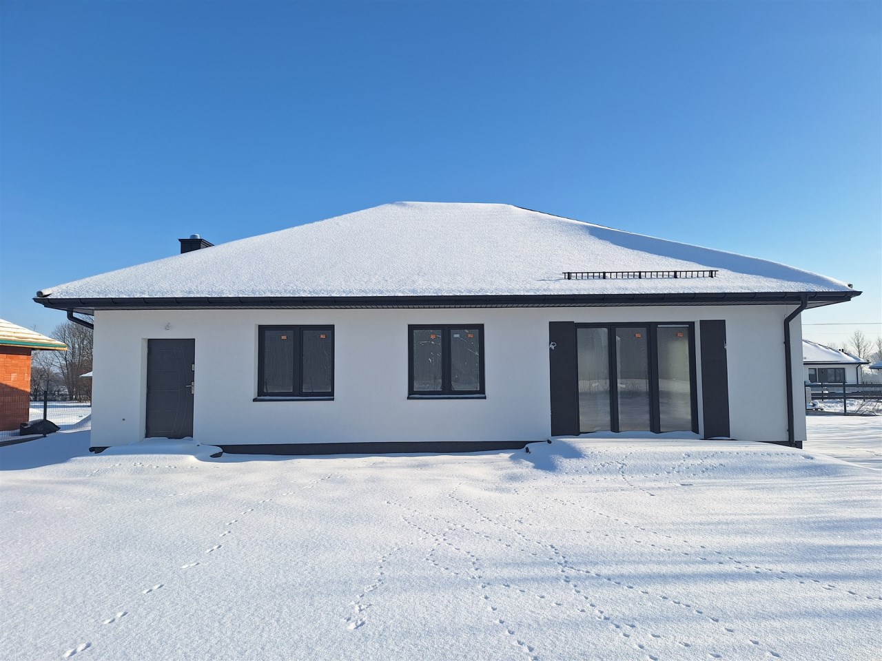 Drugi etap inwestycji w w sielskiej wsi Kamionna gm. Winnica, powiat pułtuski, koło Nasielska. W ofercie dom parterowy o powierzchni 115 mkw w stanie deweloperskim, posadowiony na działce 1160 mkw (nr ew. 32/26). Dom wzniesiony w technologii tradycyjnej, murowanej, ściany z pustaków ceramicznych. Dach pokryty blachodachówką w kolorze grafit. Okna trzyszybowe. Rozprowadzona instalacja wodna, elektryczna i ogrzewanie podłogowe (ogrzewanie do wyboru: gaz, pellet, pompa ciepła). Działka zagospodarowana: ogrodzona systemem panelowym z bramą i furtką; chodnik do drzwi wejściowych; opaska wokół domu; taras. Garaż blaszany 2-stanowiskowy na fundamencie za dodatkową opłatą 20 tys,