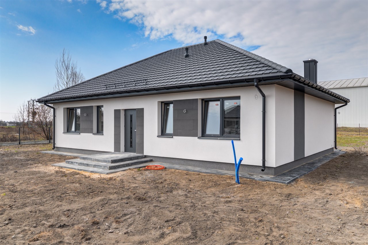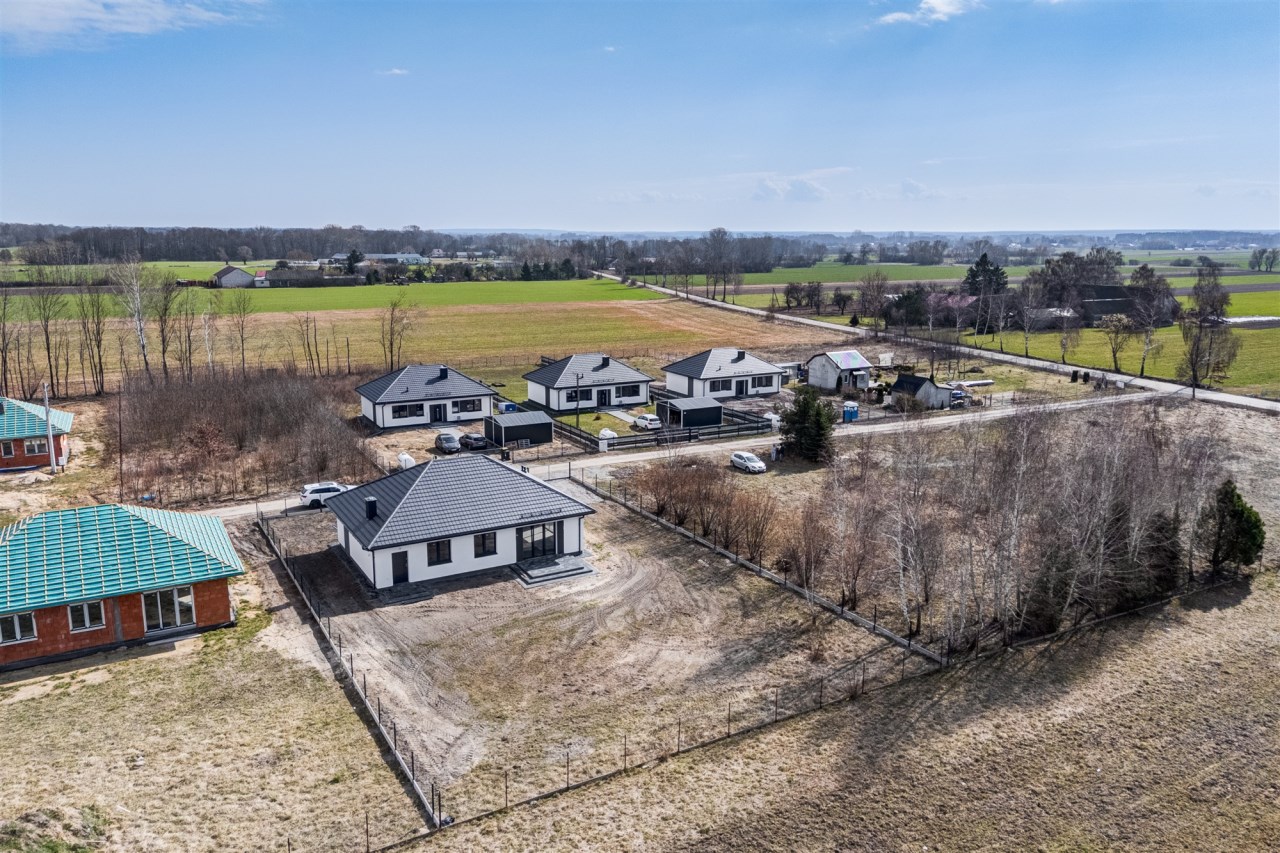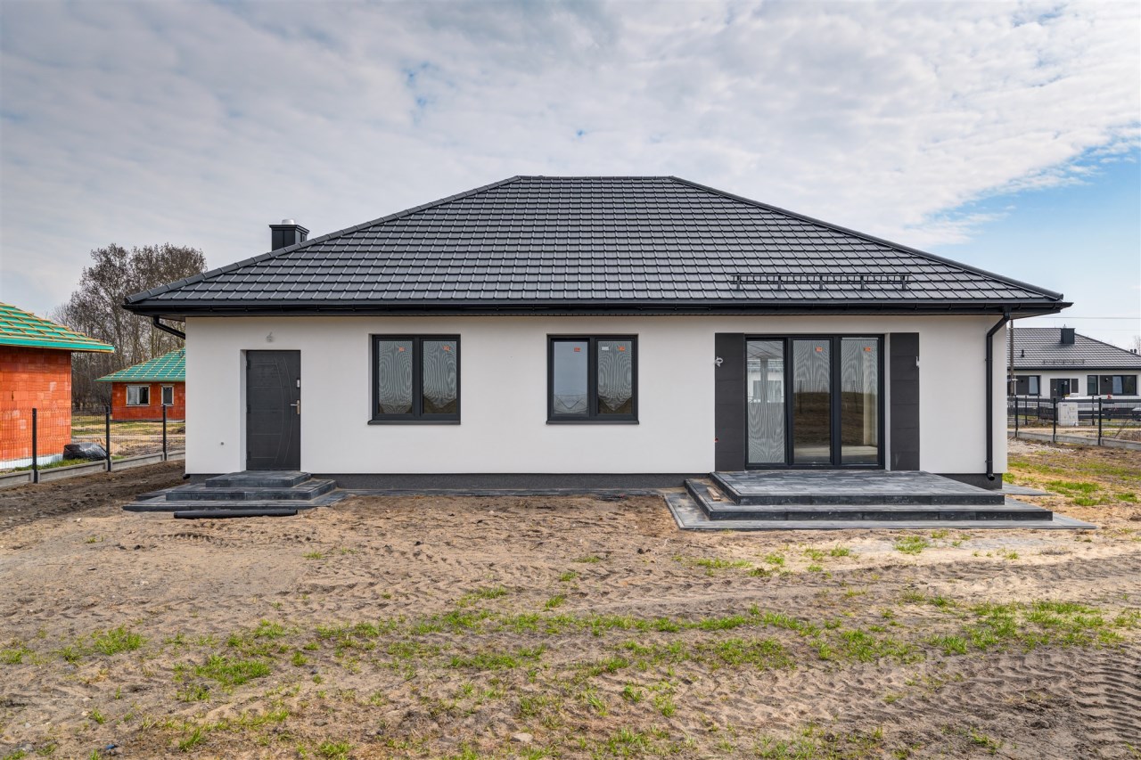 Drugi etap inwestycji w w sielskiej wsi Kamionna gm. Winnica, powiat pułtuski, koło Nasielska. W ofercie dom parterowy o powierzchni 115 mkw w stanie deweloperskim, posadowiony na działce 1160 mkw (nr ew. 32/26). Dom wzniesiony w technologii tradycyjnej, murowanej, ściany z pustaków ceramicznych. Dach pokryty blachodachówką w kolorze grafit. Okna trzyszybowe. Rozprowadzona instalacja wodna, elektryczna i ogrzewanie podłogowe (ogrzewanie do wyboru: gaz, pellet, pompa ciepła). Działka zagospodarowana: ogrodzona systemem panelowym z bramą i furtką; chodnik do drzwi wejściowych; opaska wokół domu; taras. Garaż blaszany 2-stanowiskowy na fundamencie za dodatkową opłatą 20 tys, wiata otwarta 2-stanowiskowa w cenie.